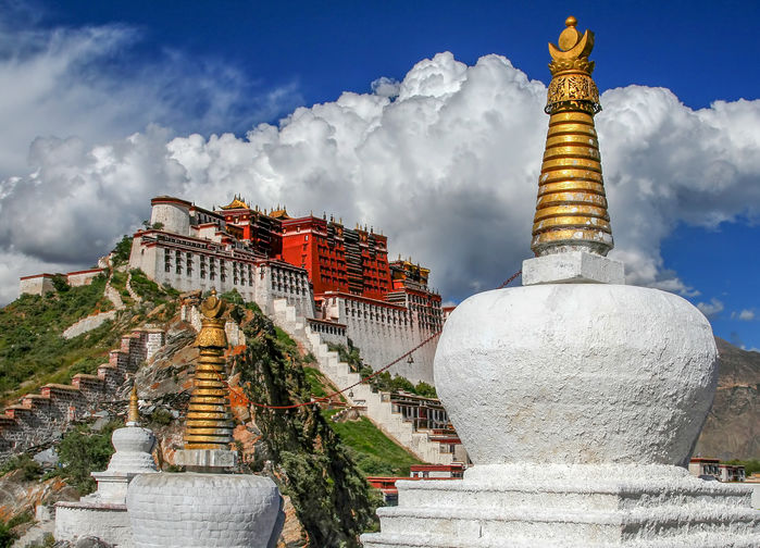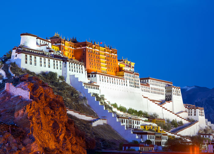 Aamiaisen jälkeen näemme vaikuttavaan Potalan palatsin, joka on rakennettu Marporin vuorelle eli "Punaiselle vuorelle". Palatsi, joka on toiminut aikaisemmin sekä luostarina että linnoituksena, näyttäytyy meille arvokkaasti kaikista suunnista. Potalan palatsi rakennettiin 1600-luvulla, ja se on jaettu punaisiin ja valkoisiin rakennuksiin, joissa on 13 kerrosta ja yhteensä yli 1000 huonetta. Palatsia katsellessa tulee helposti mieleen, että tällaista palatsia ei enää varmasti koskaan rakenneta. Emme tiedä etukäteen, mitkä Potalan palatsin osat ovat avoinna vierailijoille. Useimmiten pääsemme terassikerroksiin, joissa sijaitsevat Dalai Laman yksityishuoneet. Palatsin uskonnollinen punainen osa on aina avoinna vierailijoille, ja tänne kerääntyykin pyhiinvaeltajia kaikkialta Tiibetistä. Täältä löytyy jättimäinen jalokivillä koristeltu Buddha-veistos, entisten Dalai Lamojen haudat sekä kiehtovia seinämaalauksia, jotka kertovat buddhalaisesta ja tiibetiläisestä arjesta vuosisatojen ajan.