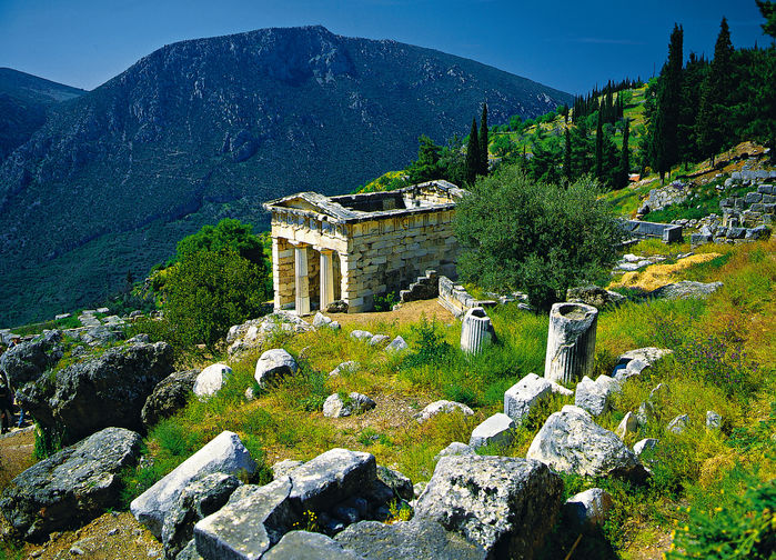 Delfoin temppelialue on säilynyt hämmästyttävän hyvin. Pyhien kulkueiden tie kiemurtelee Parnassosvuoren rinteillä mittaamattoman arvokkaita rikkauksia sisältäneiden aarrekammioiden ohi Apollonin temppelille. Temppelissä oraakkeli istui muinoin antamassa tulkinnanvaraisia vastauksiaan kysymyksiin tulevaisuudesta.