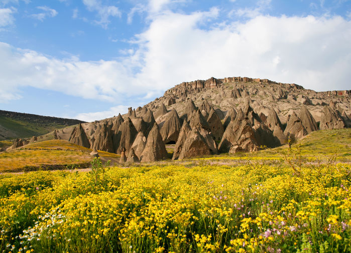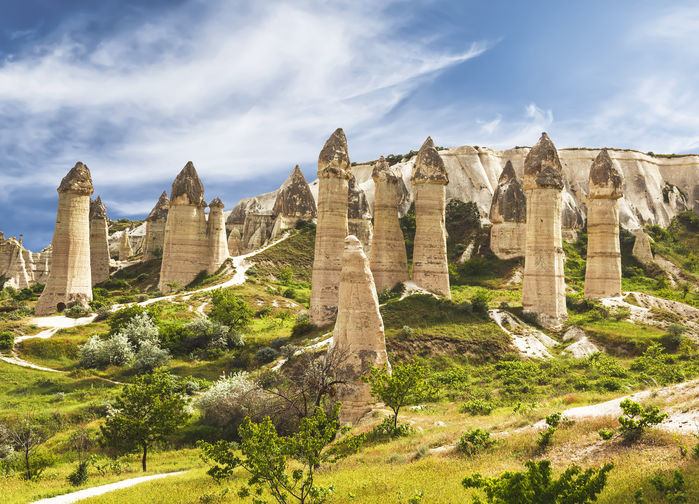 peräkkäisten ja voimakkaiden tulivuorenpurkausten johdosta, jolloin koko alue oli tuhkan peitossa. Eroosio – tuuli, sade, suuret lämpötilanvaihtelut, kuumat kesät ja synkät talvet – ovat vaikuttaneet tämän epätodellisen alueen syntyyn. Pilarit, pyramidit ja kolmiulotteiset tornit tekevät katsojaan lähtemättömän vaikutuksen. Tässä oudohkon kauniissa ympäristössä ovat ihmiset tuhansien vuosien ajan eläneet ja perustaneet kalliokirkkoja, kallioluostareita, erikoisia kyliä ja maanalaisia kaupunkeja.